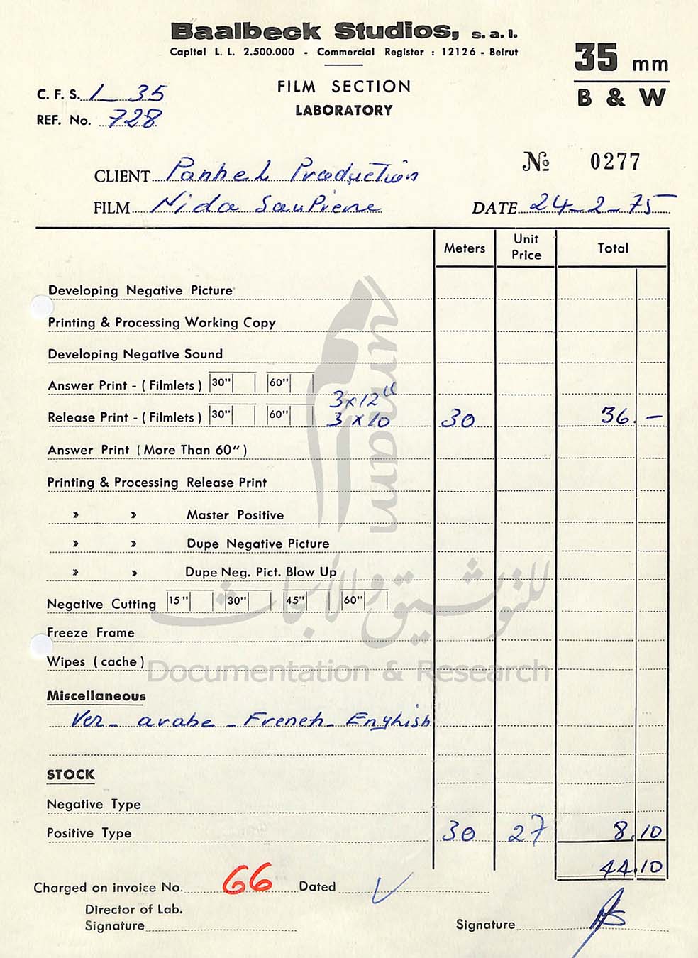 ● ملفّات مخصّصة لإنتاجات سينمائيّة بعَينها، يحمل غلافُ كلٍّ منها اسمَ الفيلم والمنتِج أو المخرج وسنة الإنتاج. تتضمّن المجموعة أفلامًا شهيرة أُنتِجت في الستينيّات والسبعينيّات من القرن الماضي وباتت جزءًا من الذاكرة الجماعية في معظم العالم العربي. بعض هذه الملفّات يتكوّن من عشرات الصفحات بينما تحوي أخرى أكثرَ من مئة وثيقة. منها لا يعطي سوى فكرة عامّة عن تبادلاتٍ محدودةٍ مع المعامل الفرنسيّة بغالبها، في حين أنَّ ملفّات أخرى تمكِّن الزائرَ من تشكيل رؤية مفصَّلة عن مسار الإنتاج، بما فيه من نوادر وتحدِّيات وشؤون مالية.