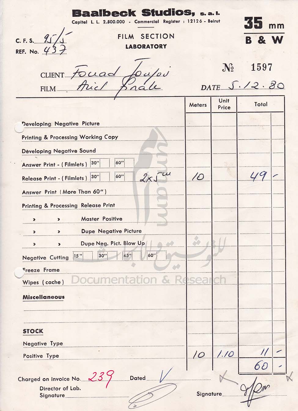 ● ملفّات مخصّصة لإنتاجات سينمائيّة بعَينها، يحمل غلافُ كلٍّ منها اسمَ الفيلم والمنتِج أو المخرج وسنة الإنتاج. تتضمّن المجموعة أفلامًا شهيرة أُنتِجت في الستينيّات والسبعينيّات من القرن الماضي وباتت جزءًا من الذاكرة الجماعية في معظم العالم العربي. بعض هذه الملفّات يتكوّن من عشرات الصفحات بينما تحوي أخرى أكثرَ من مئة وثيقة. منها لا يعطي سوى فكرة عامّة عن تبادلاتٍ محدودةٍ مع المعامل الفرنسيّة بغالبها، في حين أنَّ ملفّات أخرى تمكِّن الزائرَ من تشكيل رؤية مفصَّلة عن مسار الإنتاج، بما فيه من نوادر وتحدِّيات وشؤون مالية.
